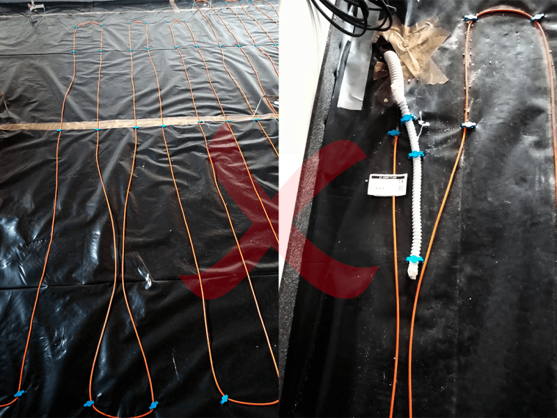 Тази снимка показва неспазване на минималното разстояние между нагревателните кабели. Разстоянието трява да е най-малко 3 см, за да се избегне дълготрайното им прегряване. В този случай кабелите на нагревателните рогозки са само на 0,5 см един от друг.