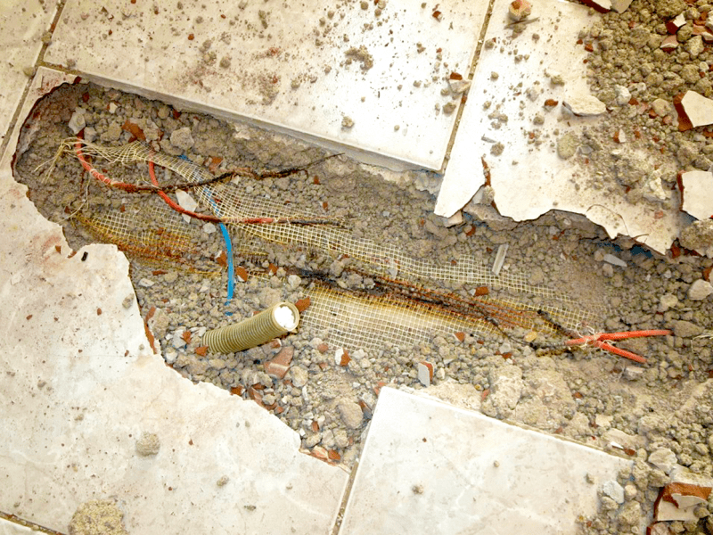 Пример как не трябва да се полагат нагревателни кабели и резултатът от това. Малко след монтажа подовото отопление в банята спира да работи, а след изкъртване на плочките се установява, че нагревателните кабели се пресичат на много места.